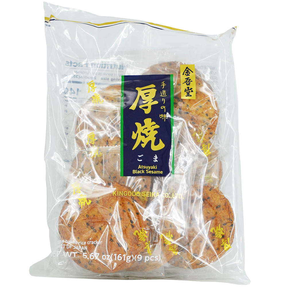 Kingodo er en meget gammel og velkendt producent af senbei, dvs. sprøde, salte og lette snacks lavet af ris. Disse store senbei kaldes "Atsuyaki", hvilket betyder, at de er "tykt ristede", altså ikke tynde kiks. De er store, og pakken indeholder 9 stk.